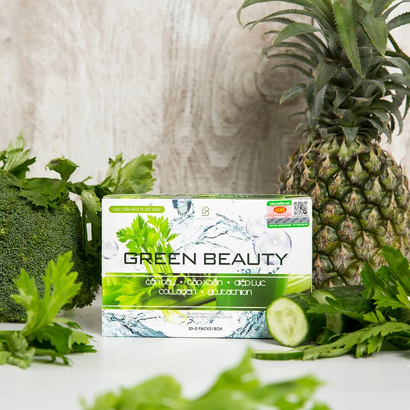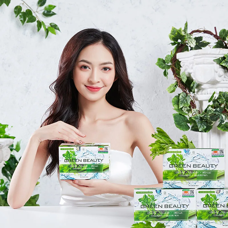 Cần tây sau khi tinh chế sẽ được kết hợp thêm 4 loại hoạt chất khác là: Collagen, Tảo Xoắn, Diệp Lục và Glutathione để tạo nên GREEN BEAUTY. Sản phẩm sẽ được đóng gói dạng viên trong các túi vô trùng và đưa đến tay khách hàng.